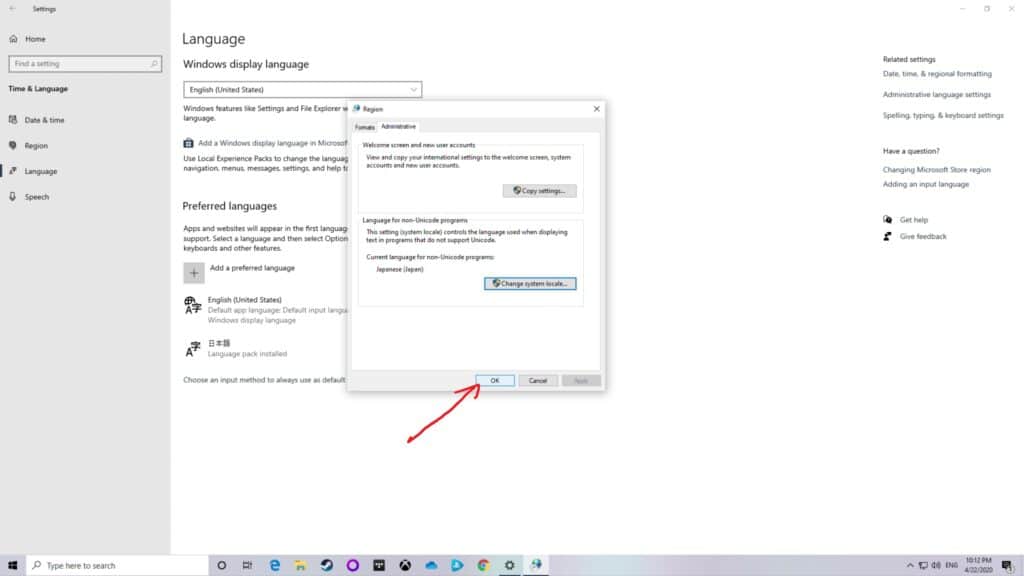 2nd:A box should pop up. Simply click on 'Change system locale'.