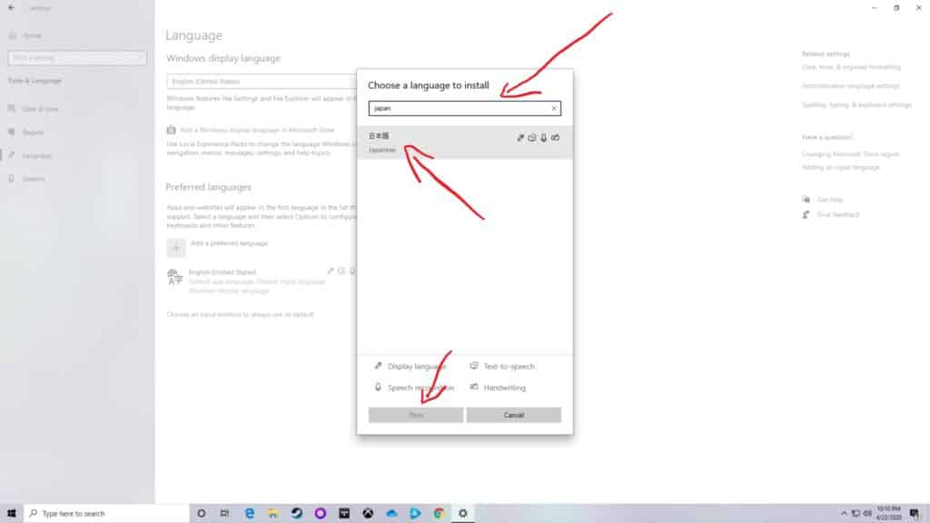 5th:A small box should pop up. You could manually scroll until you find Japanese, which I don't suggest due to there being a ton of languages, or you can simply type Japan in the search bar. Click on the language and click on Next.