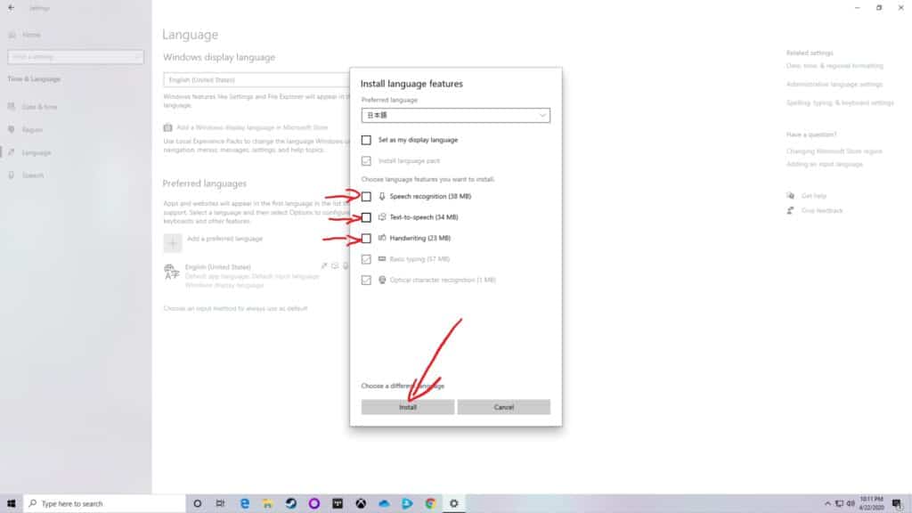 6th:Once more, a new box should pop up. If you do not intend to use Japanese on your system and just want to play a program or use an app that requires it, you should uncheck all the possible boxes to save on hard drive space. The necessary functions can not be unchecked, don't worry. Click Install and then wait a bit as it does so.