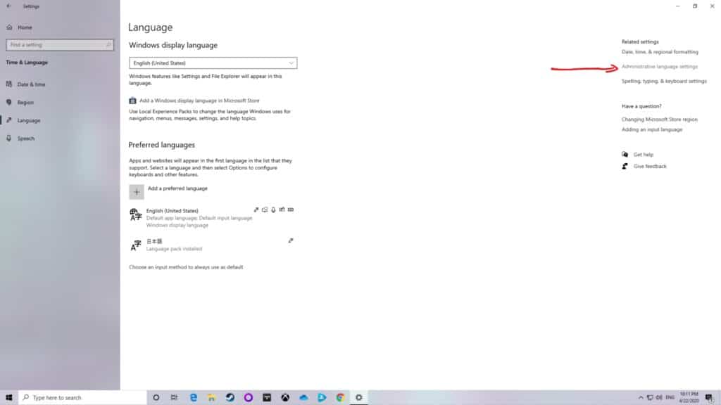 1st: Don't let that seemingly complex title scare you, this goal is actually easier than the last. After having done all the 6 steps, you will once again find yourself on the Language tab. Now click 'Administrative language settings'.
